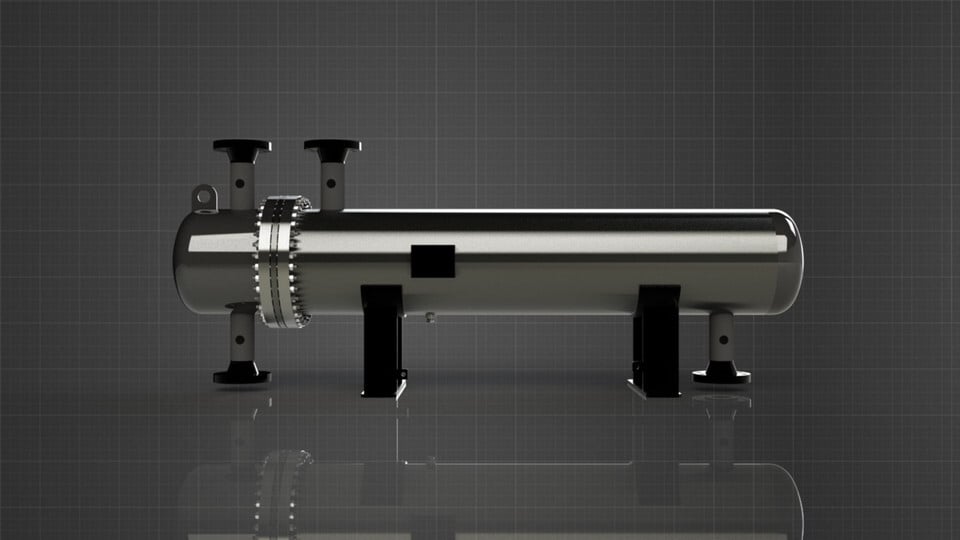 This CAD model features a horizontal shell and tube heat exchanger design, including detailed components such as: